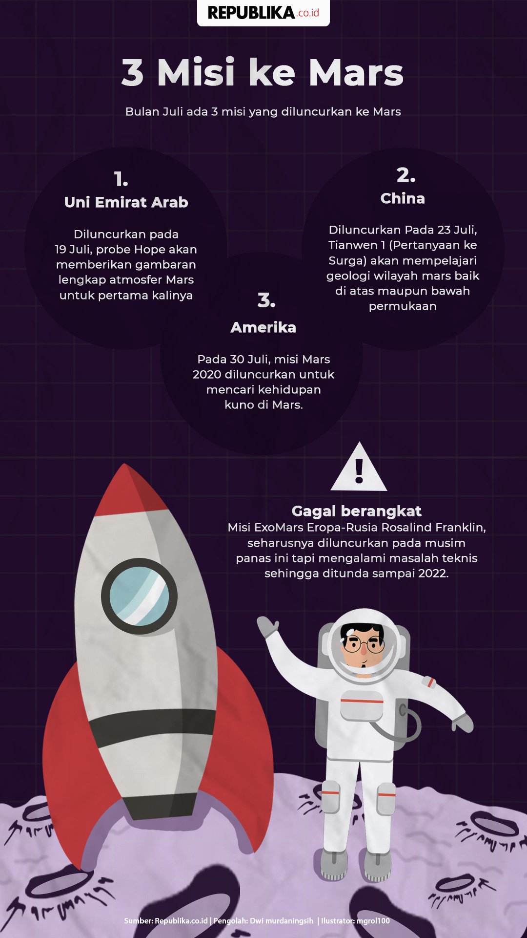 • Tianwen-1 (CNSA): Misi Tiongkok ini berhasil mendaratkan rover Zhurong di Mars pada tahun 2021, menjadikannya negara kedua setelah Amerika Serikat yang berhasil mendaratkan rover di Mars.